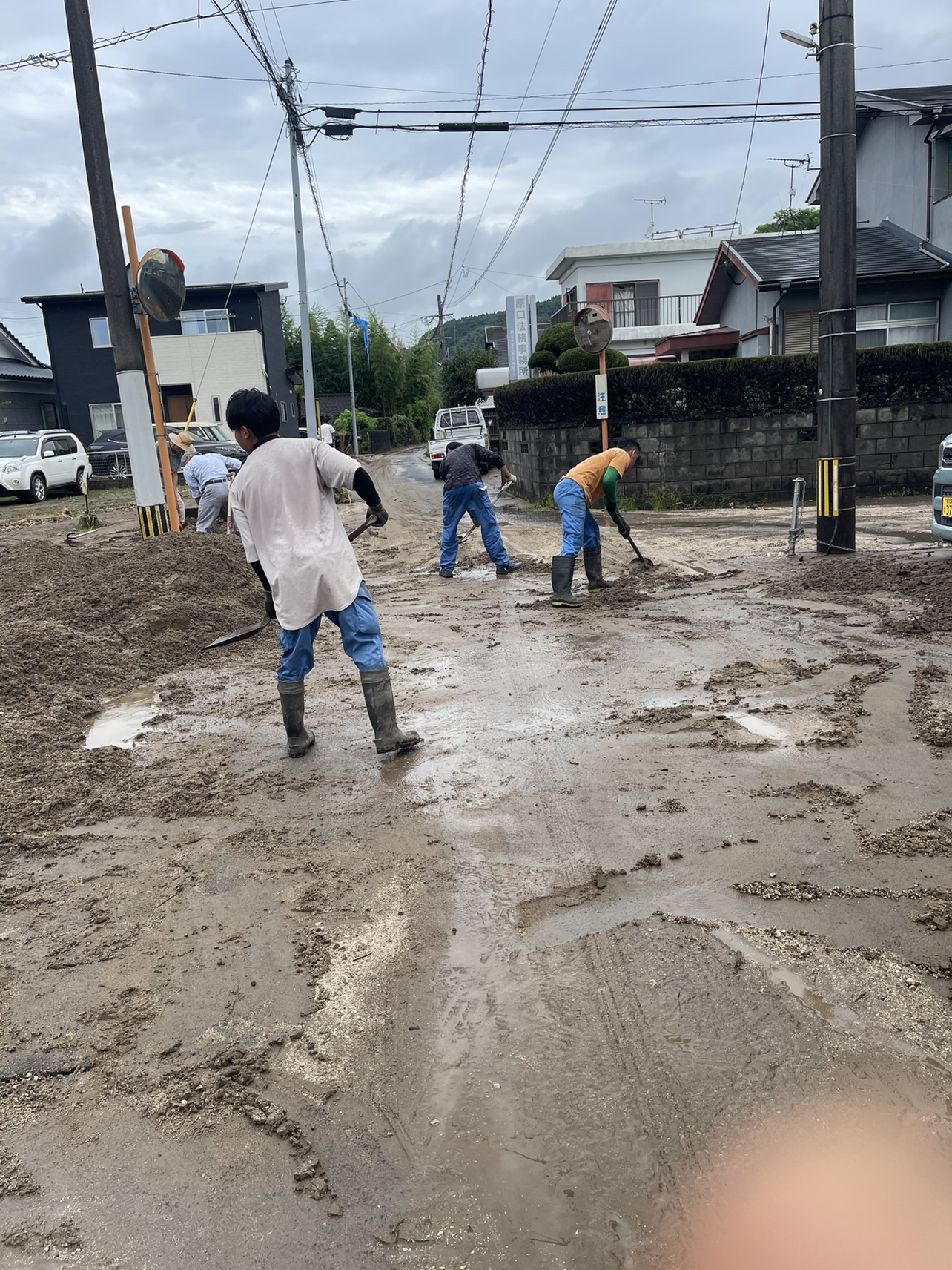 8月上旬に姶良地区を襲った豪雨災害はいまだにあちこちで詰め跡を残し、日常生活にも大きな影響を与えています。8月7日から降り続いた雨で近くの網掛川が氾濫し、姶良本社前の道路にも大量の土砂が流れ込みました。近所の皆さんが交差点内に溜まった土砂の除去作業をされており、弊社からもすぐにインドネシアからの技能実習生とともに職員を手伝いに向かわせ、応急的な復旧に微力ながら貢献させていただきました。マンパワーが必要とされているときに、若くて力のある技能実習生が頑張ってくれました。