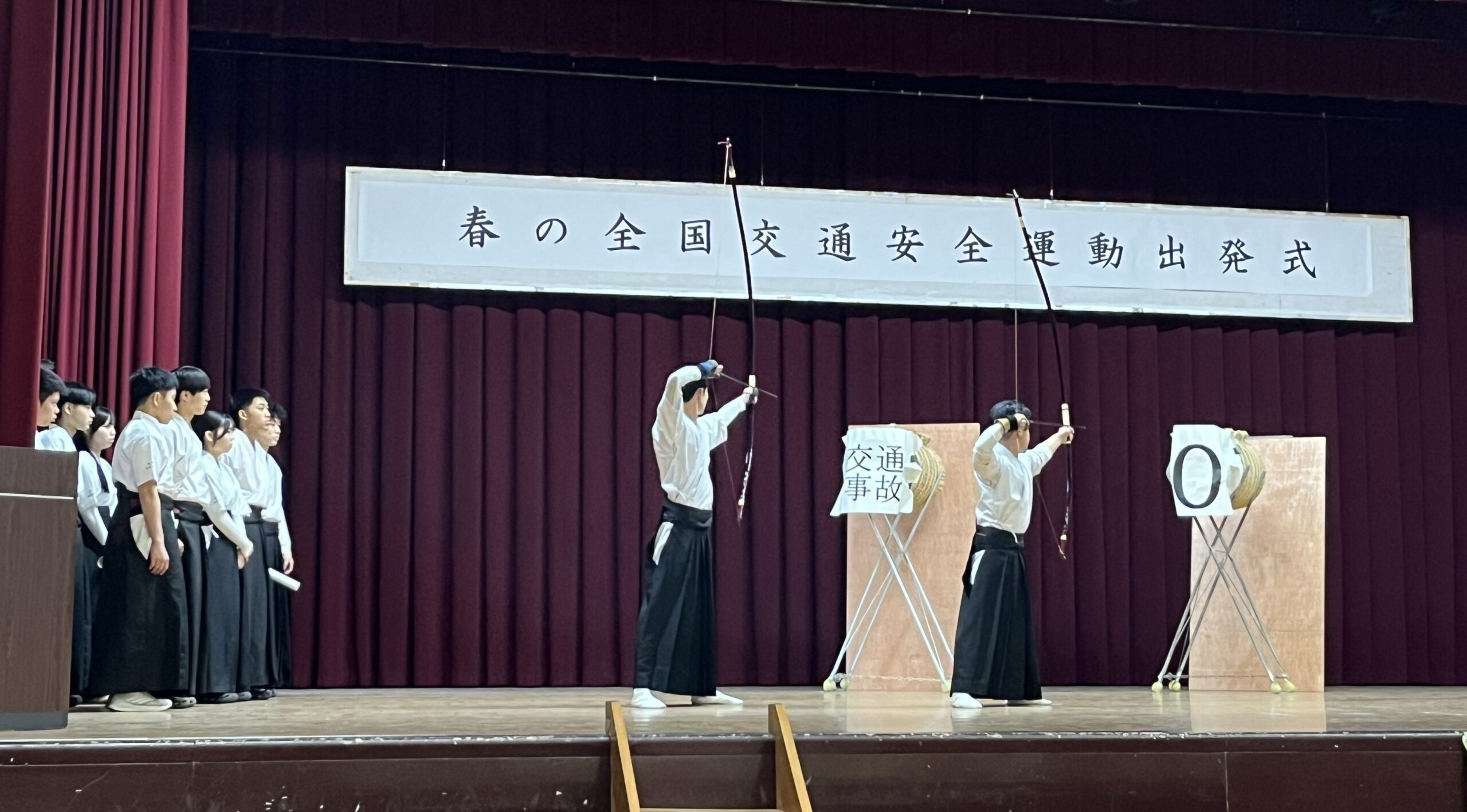 今年の出発式では地元の加治木工業高校弓道部の皆さんが交通事故0を目指し、事故に見立てた的を射抜くパフォーマンスを披露してくれました。弊社も多くの事業用車両を管理していますので、全社員に交通安全への意識向上を図るように周知徹底してまいります。